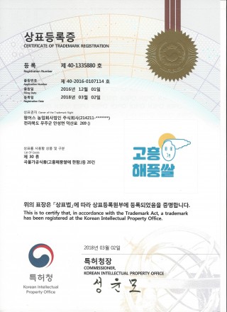 고흥해풍쌀 상표등록증